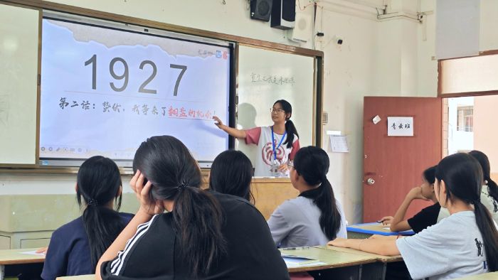 7月12日至7月20日,華南師范大學書畫協會流墨實踐服務隊與茂名市信宜市懷鄉鎮懷鄉第一中學共同舉辦“流墨執筆,筑夢信宜”線下夏令營暑期社會實踐活動。為全面貫徹落實“時代新人鑄魂工程”,推動紅色文化與日常教學有機融合,以增強當代青少年永遠跟黨走的信仰信念信心,為鄉村振興匯聚強大的人才力量,流墨隊文教組以懷鄉鎮四年級至初三的學生為對象,組織開展了紅色思政課程。紅色思政課程主講人由文教組的游君敏、李妍蓓、高佳瑜擔任。