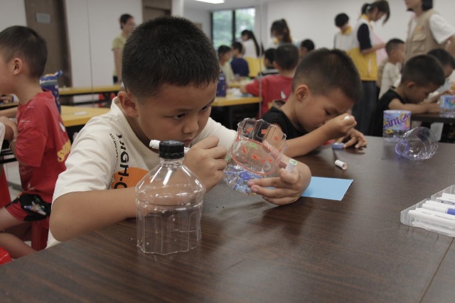 圖2 小朋友利用廢塑料瓶進(jìn)行藝術(shù)創(chuàng)作 何翠婷 攝。