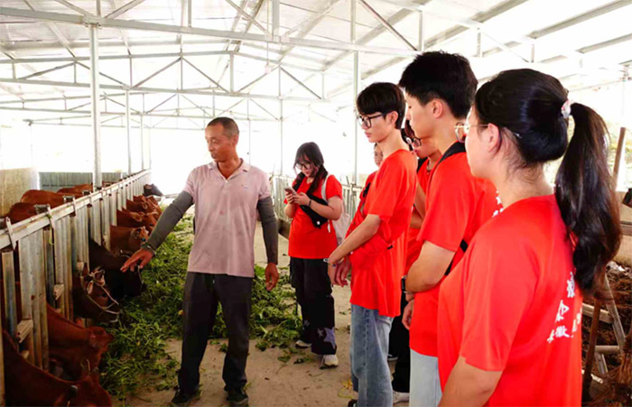 在余振華的帶領下,實踐團成員深入養殖棚區,近距離觀察小黃牛的生長發育環境。同學們一邊認真記錄,一邊與養殖人員交流探討,詳細了解日常飼養、疫病防治、品質管控等各個環節。通過實地調研,團隊成員深刻體會到科技創新對傳統養殖業的提升作用。