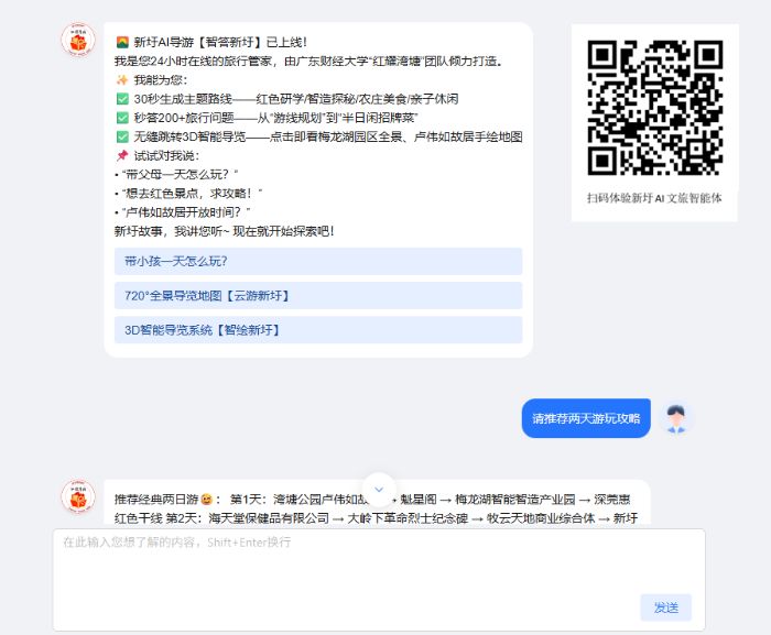 最具創新性的“智答新圩”智能文旅伴游,依托Deepseek最新大語言模型進行本地化訓練,接入新圩鎮歷史文化、產業特色、旅游資訊等語料數據,打造出專屬于新圩的AI導游助手。該應用支持24小時智能問答,可實時響應游客關于本地旅游攻略、交通動線、特色美食、紅色歷史等方面的疑問,并能根據用戶偏好一鍵生成紅色研學、農莊美食、工業探秘等主題定制游覽路線。此外,“智答新圩”還集成前兩大系統的核心功能,實現對智慧地圖與全景導覽的無縫調用,真正實現“即問即答、即觸即達”的智慧游覽新體驗。
