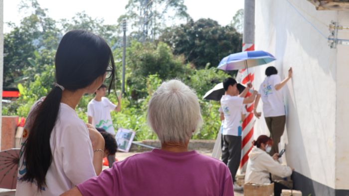 ▲圖為突擊隊墻繪時吸引下西村村民們參觀