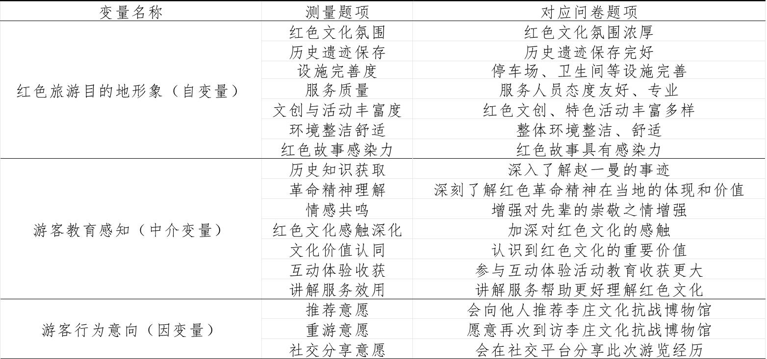 二是深化并創新變量關聯,研究聚焦“目的地形象—教育感知—行為意向”的鏈式影響機制,在單獨分析目的地形象作用的同時,深入探究教育感知的中介效應,進而挖掘紅色旅游目的地與游客間“形象認知—價值認同—行為轉化”的內在邏輯,以彌補現有研究對變量間傳導關系關注不足的短板。