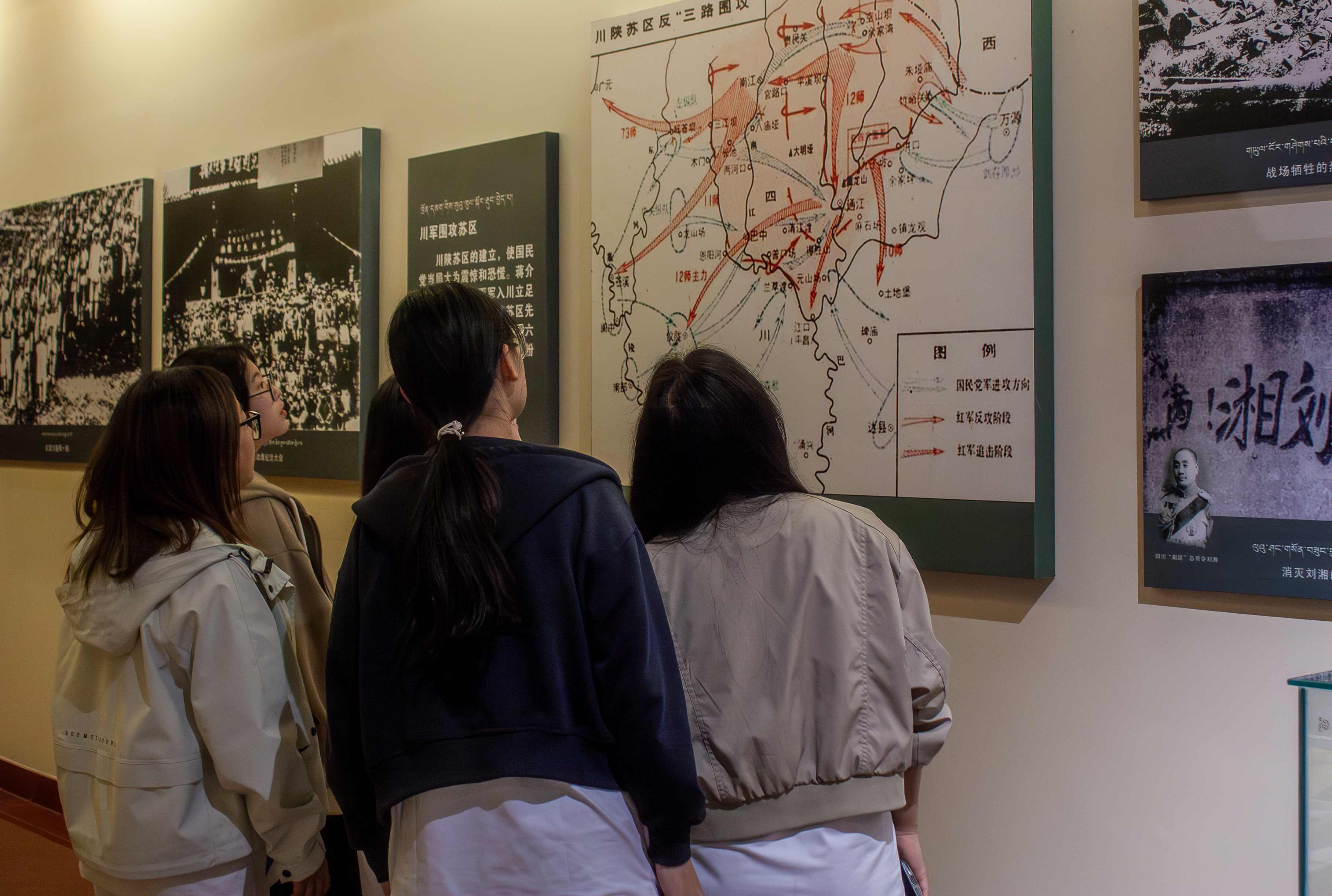 木棉傳語推普小隊前往鄉城縣紅軍紀念館開展參觀學習活動,重溫紅色歷史,感悟軍民情誼。在紀念館內,小隊成員們重點參觀了展現鄉城人民迎接與歡送中國工農紅軍第六軍團的場景圖,直觀感受了當年紅軍過境時軍民互動的溫暖畫面。同時,大家還近距離觀摩了紅軍使用過的馬鞍、軍裝、綁腿等生活用品,以及槍、大炮等武器裝備,還有書具、時報等歷史文獻,這些實物與史料生動還原了紅軍當年的生活與戰斗風貌。