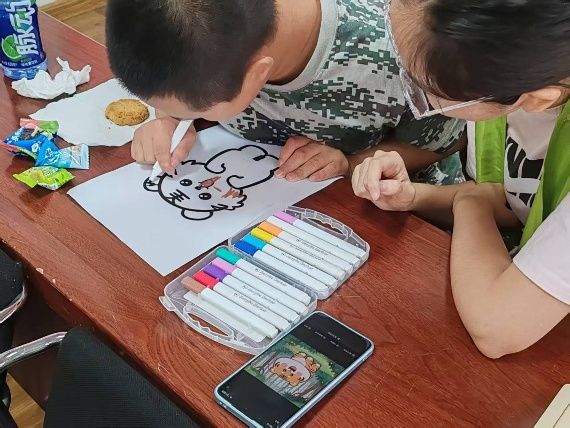 志愿服務團隊通過彩泥塑形和創意繪畫等藝術創作與互動游戲,為自閉癥兒童搭建內心橋梁。彩泥在“星寶”手心揉捏,變出憨態可掬的小動物;畫筆流淌色彩,繪出他們眼中的斑斕世界;拼圖一塊塊拼合,搭起認識世界的奇妙窗口。志愿者們始終在旁,目光溫柔,輕聲鼓勵。伴隨著一聲聲肯定,在這充滿色彩與觸感的安心小天地里,孩子們用小手感受著軟泥的溫柔,探索著形狀的奧秘。