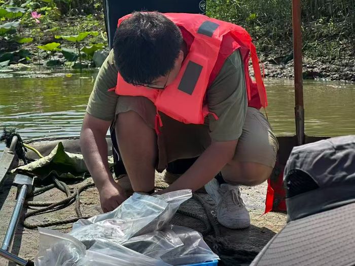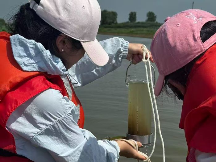 團隊成員們馬不停蹄,奔赴洪澤湖濕地國家級自然保護區多個關鍵地點進行水體和底泥采樣工作,每到一處,大家都嚴格按照科學規范,進行水樣和底泥采集,不放過任何一個細節。水面在陽光的照耀下波光粼粼,但成員們無心欣賞美景,專注地進行著采樣前的準備工作,認真記錄著周邊環境信息。團隊成員們仔細觀察水體的顏色、氣味,并對水樣進行溫度測定,憑借所學知識初步判斷水質情況。大家深知采樣意義重大,操作更加嚴謹細致,小心翼翼地采集樣品,期待能從這些樣品中獲取最準確的數據,為洪澤湖的生態保護提供關鍵依據。