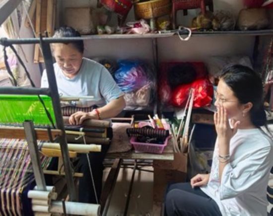圖為實踐團成員與傣族奶奶交談傣錦制作 張政升攝