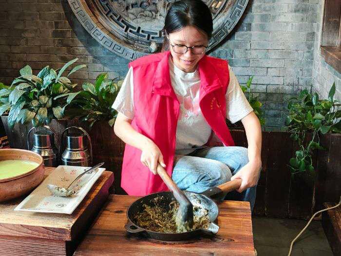 圖為實踐隊成員在非遺恭城油茶縣級傳承人劉老師指導下體驗油茶制作技藝。黃思瑩 黃希維 供圖