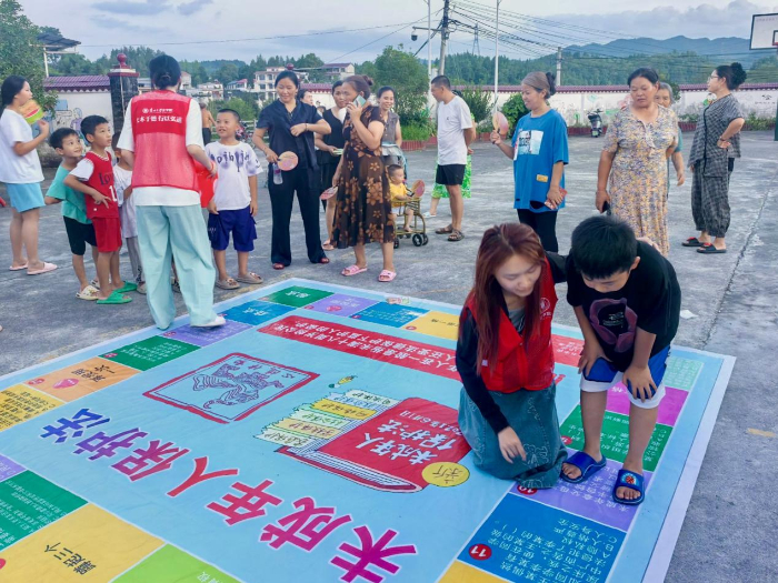 游戲化普法:讓法律條文從 “文本” 變 “童話”真人飛行棋“走”出法律意識(shí)。在瓦廠村委會(huì)廣場(chǎng)上,一張3米見(jiàn)方的巨型“法治飛行棋”游戲墊格外吸睛,色彩鮮明、格格有料。實(shí)踐隊(duì)員把《未成年人保護(hù)法》《反電信網(wǎng)絡(luò)詐騙法》等法律知識(shí)融入傳統(tǒng)游戲,通過(guò)擲骰子、走棋格、答法律問(wèn)題的方式,讓未成年人在趣味互動(dòng)里輕松學(xué)法律、強(qiáng)意識(shí)。當(dāng)孩子們踩中“校園欺凌”格,實(shí)踐隊(duì)員便依托專業(yè)背景,結(jié)合真實(shí)案例即時(shí)講解,入腦入心。20余名鄉(xiāng)村兒童化身“法治小衛(wèi)士”,在棋盤穿梭間通過(guò)“走一步、學(xué)一條”的方式,讓法律從抽象條文變成具象指引。“遇到同學(xué)被欺負(fù)要立即報(bào)告老師!”一句鏗鏘童聲響徹廣場(chǎng),孩子們對(duì)法律條文的精準(zhǔn)復(fù)述,正是法學(xué)賦能與游戲創(chuàng)新激蕩出的火花。