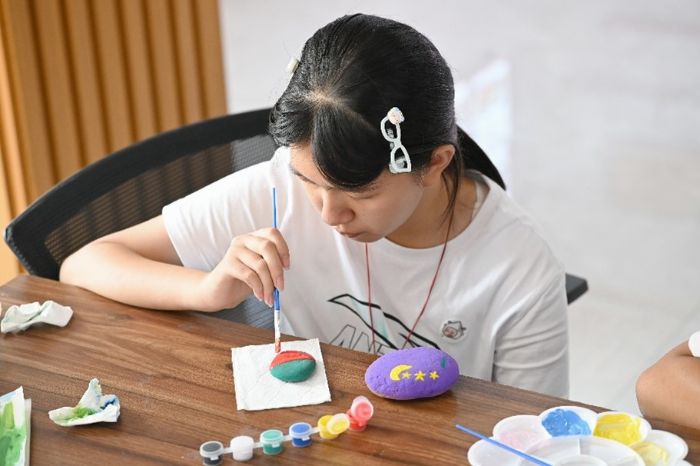 上午的最后一節課由張慧賢老師進行教課。本次課程以“繪聚童趣,彩墨飛揚”為主題,用幾塊形態各異的石頭作為天然畫布,一同尋找“自然的呼吸”與“凝固的鄉韻”。在張慧賢老師的引導下,學生們開始觀察石頭。無論是它獨一無二的形狀、毫無規律的色彩分布,還是每一處紋路,這些看似平凡的地方,都能引發無數的聯想。大家都拿起了畫筆,蘸取顏料,在自己的小石頭上肆意涂抹。平凡的石頭逐漸變成一件件充滿童趣的、獨一無二的藝術品。學生們在聽講中感受非遺文化的博大精深,在創作中釋放天性、表達自我。