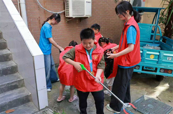 課堂結束后,在社區人員和實踐隊員的帶領下,小朋友們進行了環保公益活動。小朋友們在社區與實踐隊員們一起,撿拾垃圾,深切體會環保的意義。