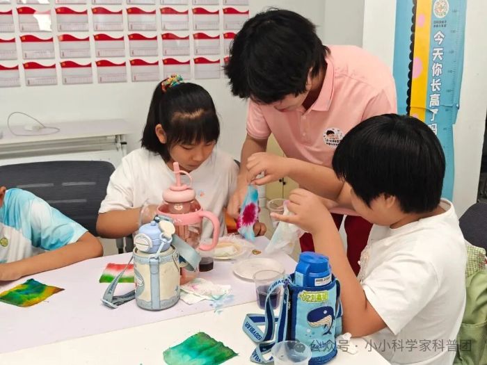染色實驗環節,孩子們了解到鹽作為固色劑的妙用,過程中看著布料在染液中慢慢變色,孩子們滿心期待,感受纖維吸色的奇妙,人工造紙環節,孩子們將衛生紙泡軟揉成紙漿,倒在濾網上鋪平、壓干,散開的纖維便重新粘合成一張新紙。孩子們看著自己親手造出的紙,臉上滿是成就感。