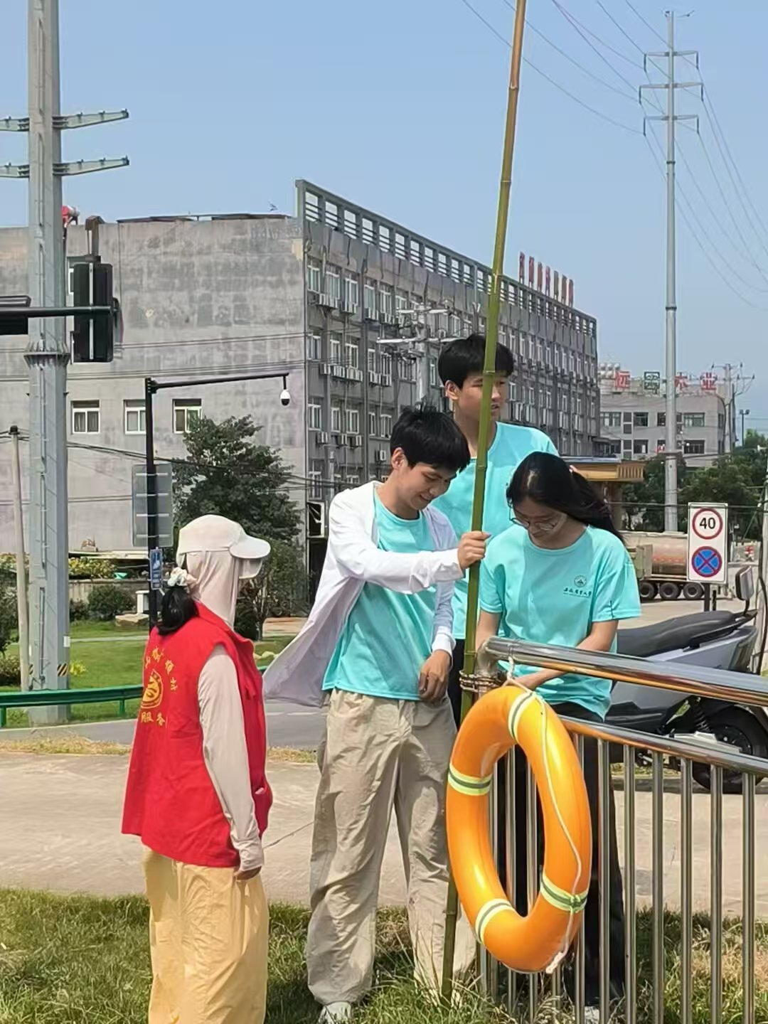 開順村毗鄰史河,正值夏季汛期,史河水位高,有溺水風險。在村委會的帶領下,實踐團成員與社區網格員共同前往堤壩旁進行巡檢工作排查溺水風險。同時巡查堤壩旁的救生設備是否有缺失。團隊成員幫助網格員進行救生用具的補缺,認真檢查、固定救生用具,確保一繩一桿一圈三樣救生設備齊全,讓其成為水域旁安全守護符。在巡檢結束后,社會實踐團成員拿著防電詐與防溺水的宣傳單穿梭在街巷間,及時開展“反詐與防溺水”宣傳活動,深入到居民家中耐心講解詐騙套路,溺水危害,讓其意識到嚴重性,確保鄉村安全。