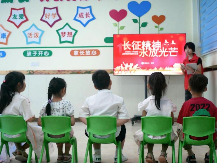 在本次紅色文化課程的實施過程中,實踐隊成員首先借助一段富有教育意義的動畫視頻《那年那兔那些事》作為課程的導入,激發了他們對紅色歷史的探究欲望。繼而,實踐隊成員對長征精神的核心要素進行了深入的講解,重點闡述了長征精神的四個基本特征:樂于奉獻、勇于斗爭、注重實際、擅長團結。通過回顧紅軍戰士在長征中的重大歷史事件,給孩子們灌輸了團結互助的重要性,以及在面臨挑戰時,秉持實事求是、敢于創新的態度的必要性。