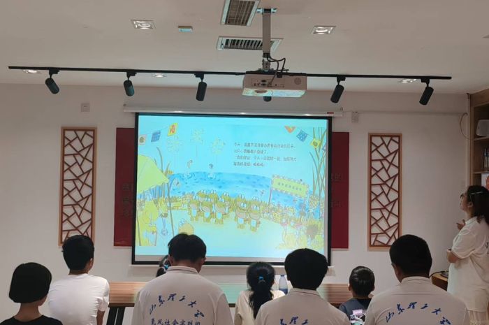 趣味繪本環節熱鬧開場,志愿者繪聲繪色地講起《10只小青蛙的運動會》。故事里,小青蛙們正在進行激烈的拔河比賽,突然襲來的龍卷風卷走了青蛙爺爺。為了救回爺爺,它們勇敢踏上征途:面對像平衡木一樣陡峭的山路,它們互相鼓勵著穩步前行;遇到需要合力推動的大石頭,它們像參加推球比賽般齊心發力;最后靠著拔河時的默契拉起藤蔓,成功將爺爺救了回來。當志愿者提問“小青蛙們靠什么成功”時,孩子們異口同聲喊出“團結”“堅持”。這場生動的故事讓孩子們明白,運動不只是簡單的競技,更藏著勇敢面對困難的勇氣和與伙伴協作的智慧,每個人都聽得格外投入。