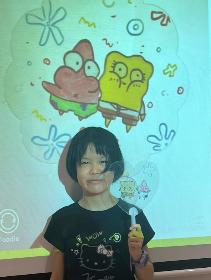 涼扇繪制完成,孩子們興奮地舉起自己的作品。有的高高晃著畫滿卡通形象的扇子,喊著“看我的海綿寶寶在跑步”;有的舉著西瓜圖案的扇面,說“風一吹都是甜甜的”;還有人小心托著蝴蝶扇,展示翅膀上的漸變色彩。大家爭相把扇子湊到志愿者面前,嘰嘰喳喳講著畫里的故事,扇動的涼風混著笑聲,把滿室的快樂輕輕揚起,每一把扇子都成了獨一無二的“快樂勛章”。