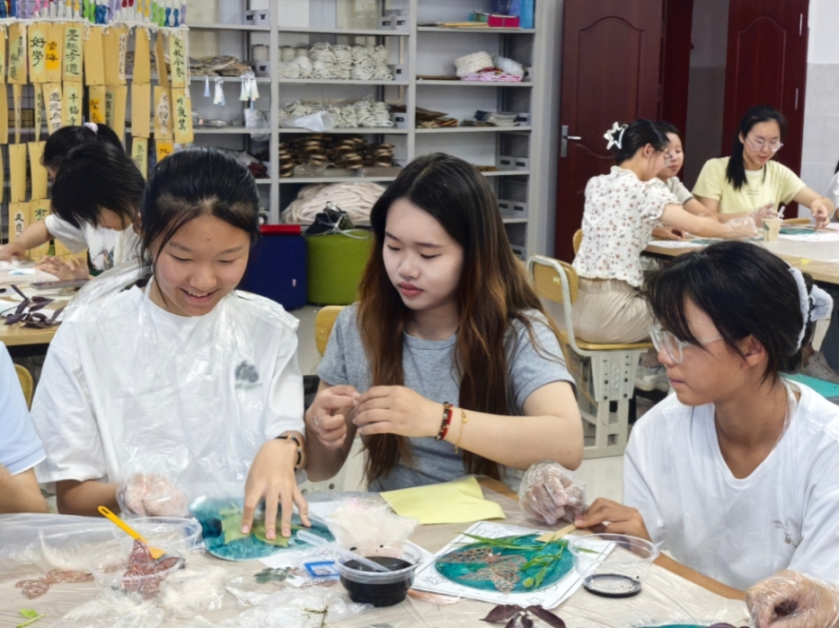 閉營儀式上,手工皂的瑩潤、蠶絲扇的輕靈、藍曬畫的深邃與那面凝聚心血的“經緯黨旗”同臺展示。在巨幅黨旗下合影的瞬間,四日的知識浸潤、匠心磨礪與情感升華,定格為這個夏天最熾熱的成長勛章。