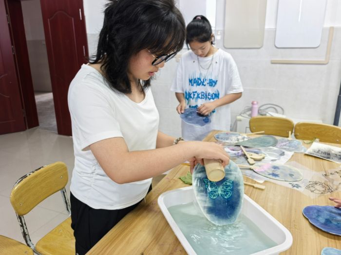 光影與化學的魔法在藍曬工藝中上演。涂布感光液的卡紙如同等待書寫的藍色詩篇。孩子們精心排列蠶繭、桑葉,輔以象征信仰的紅色剪紙元素。陽光成為最神奇的畫師,曝曬、流水沖洗后,普魯士藍的深邃背景上,蠶桑的印記與紅色的信仰交相輝映,凝結成獨一無二的光影藝術。孩子們展示藍圖,講述的不僅是構圖巧思,更是對“經緯交織,團結奮斗”的生動理解。