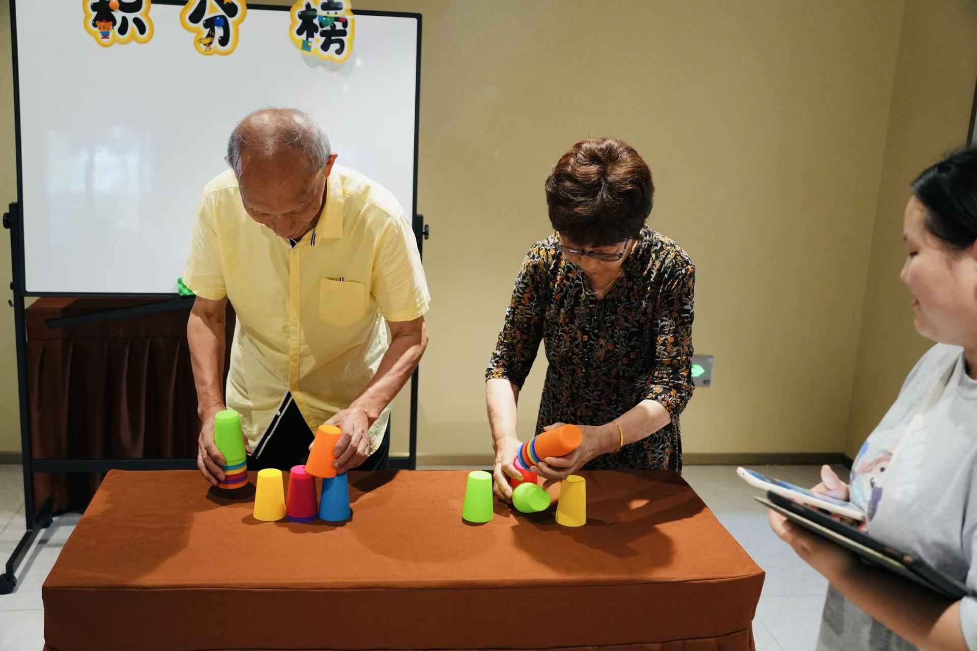 在國(guó)投寶原養(yǎng)老綜合體中心的活動(dòng)空間內(nèi),一場(chǎng)基于老年心理學(xué)的團(tuán)體輔導(dǎo)正在有序開展。“金曲搶答賽”環(huán)節(jié)中,當(dāng)《歌唱祖國(guó)》的旋律驟然響起,一位身著藏青色外套的爺爺猛地睜大眼睛,率先舉起了手;“紙杯疊疊樂(lè)”比賽中,68歲的李奶奶手速驚人,紙杯在她手中迅速成型,引得臺(tái)下老人連連稱贊。這些活動(dòng)作為前期干預(yù),為后續(xù)的暖心對(duì)談創(chuàng)造了安全的心理場(chǎng)域。
