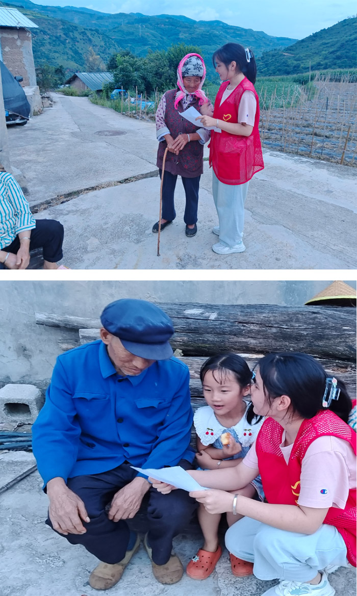 01入戶聽聲:問卷為媒,聯結心與心的距離 推普服務隊的志愿者們率先踏入田壩村的家家戶戶,展開簡短訪談與簡易問卷調查。每一扇門扉后,都涌動著村民淳樸的熱忱。志愿者與村民圍坐一處,以親和話語問詢日常交流中普通話的使用情況、遭遇的難題及學習需求。從老者帶著鄉音的絮語,到年輕父母對子女語言教育的關切,字字句句都承載著鄉村對更廣闊交流世界的向往。志愿者們悉心記錄每一份需求,為后續推普工作錨定精準方向,再添鄉土溫度。