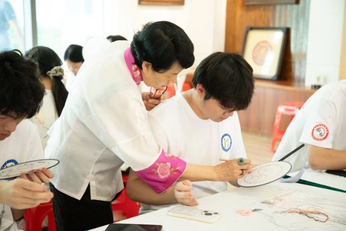 圖為王子怡大師指導(dǎo)“拾遺”隊員繡制團扇。 王可仁供圖