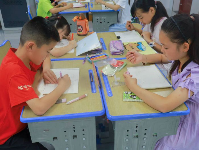 而繪畫課堂則是創意與想象的天地。實踐隊隊員站在講臺上,通過大屏幕展示繪畫的奇妙世界,引導孩子們拿起畫筆,描繪心中的美好圖景。孩子們專注地用手中的彩筆,勾勒線條、涂抹色彩,將對生活的熱愛、對未來的憧憬呈現在畫紙上。從多彩的校園風景到夢幻的童話世界,每一幅畫作都飽含著童真與幻想。