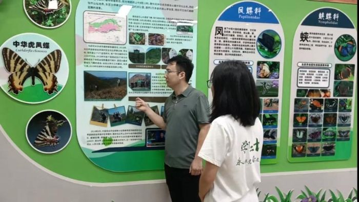 (張所長為調(diào)研團(tuán)隊(duì)講解中華虎鳳蝶)