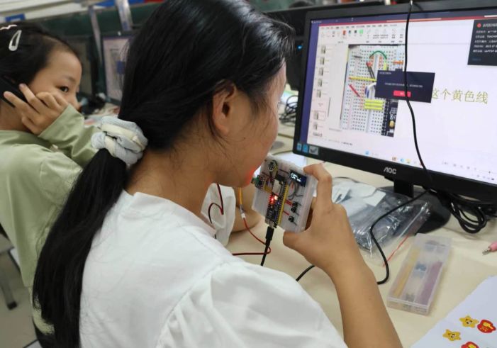 “我的AI伙伴:誕生!”實踐課無疑是整個支教的高光時刻。孩子們化身“小小工程師”,遵循著指導,一步步組裝零件、連接線路。當親手創造的AI玩具第一次“活”過來時,他們臉上綻放出的驚喜與自豪,勝過千言萬語。這不僅是一次技術的實踐,更是在他們心中埋下了一顆“我能創造”的自信種子。而最動人的風景,出現在課堂的角落:兩個內向的小女孩正與她們親手創造的AI伙伴輕聲說著“悄悄話”。那一刻,科技真正成為了有溫度的陪伴。