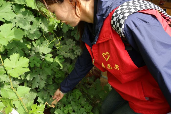 此圖為團隊隊員為居民科普葡萄病害種類 董喬喬 供圖