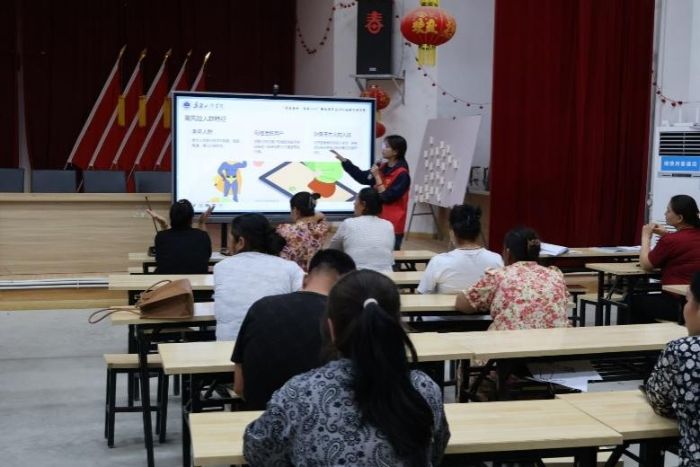 此圖為實踐團隊員向居民就宣傳冊上的新型詐騙手段進行講解。曹渭荻供圖