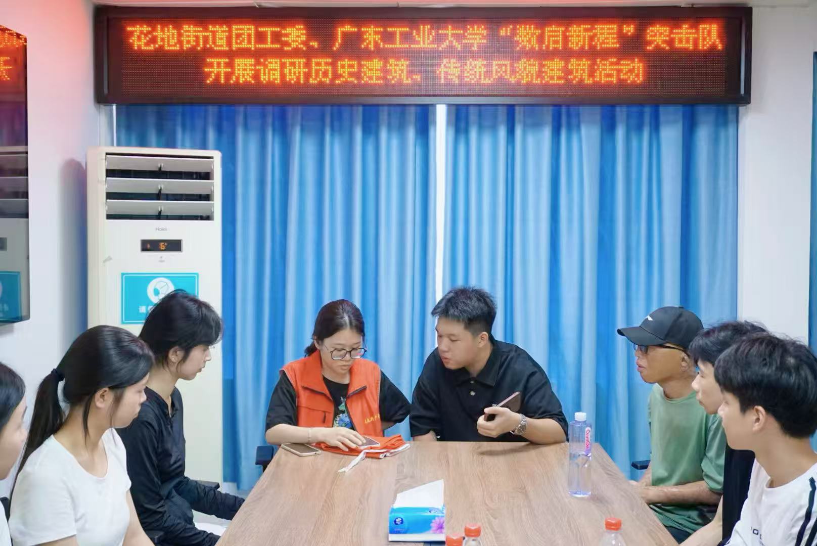 活動伊始,突擊隊與花地街道團工委開展專題座談。團工委對團隊圍繞古建筑遺跡展開調(diào)研表示高度支持,并對落實文化保護工程提出指導建議。街道團工委辦事員吳芷媚指出,當前花地街道歷史建筑存在宣傳力度不足、資源整合不充分等問題,希望團隊發(fā)揮學科優(yōu)勢,以“紅色文旅+數(shù)字技術(shù)”為突破口,協(xié)助打造學生實踐基地,加強街區(qū)資源聯(lián)動,深入挖掘在地文化亮點。