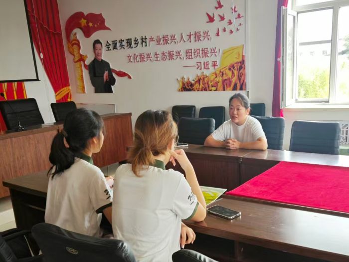 實踐團一行抵達玉林村后,首先前往村委會議室開展入村調研。玉林村村委干部夏菲菲圍繞村莊省級“龍匯居民”試點建設成果、鄉村振興整體規劃及校地合作典型案例展開詳細講解,從基礎設施完善到特色產業培育,從生態環境治理到村民收入增長,全面呈現了玉林村近年來的發展變遷。“我們通過‘龍匯居民’試點建設,整合了村內閑置資源,不僅改善了村民居住環境,還為后續發展鄉村旅游打下了基礎。”夏菲菲書記介紹道。實踐團成員認真記錄講解內容,不時就村莊產業布局、人才引進政策等問題提問,現場交流氛圍熱烈,為后續實踐活動的開展筑牢信息基礎。