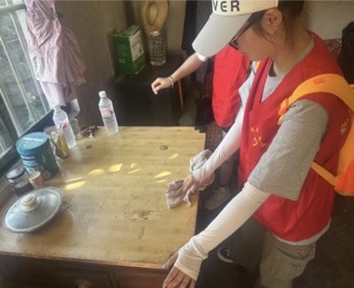 在隔壁的李大爺家,隊員們遇到了更棘手的情況:老人行動不便,廚房的灶臺積了厚厚的油垢,床底下堆著許久沒清理的雜物。“大爺,您放心,今天保證給您收拾得干干凈凈!”隊員小朱和小相挽起袖子,先用熱水將灶臺泡軟,再蘸著洗潔精一點點擦拭,油污濺到了胳膊上也毫不在意。經過三個多小時的整理,原本昏暗雜亂的屋子變得窗明幾凈,老人看著疊放整齊的衣物,拉著隊員的手哽咽道:“比我親娃想得還周到啊。”