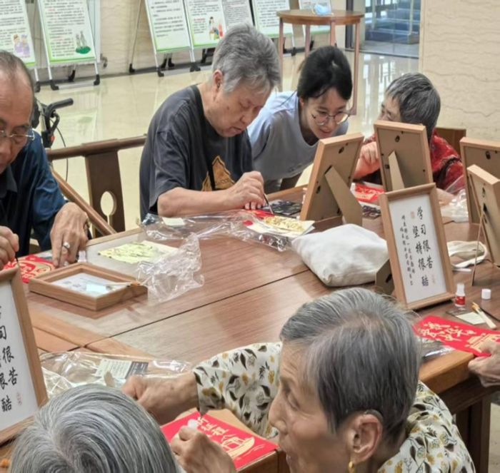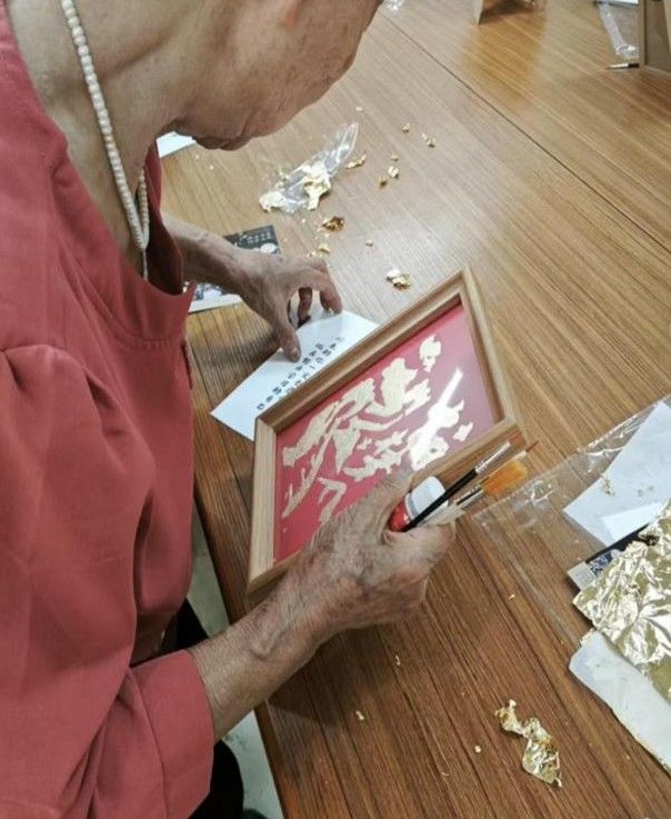 手工創(chuàng)作,解鎖藝術(shù)樂趣 7月3日,活動圍繞“傳統(tǒng)文化與藝術(shù)體驗”展開,通過多樣手工形式為老人們帶來別樣的精神滋養(yǎng)。上午的手工課上,隊員們?yōu)槔先藗兎职l(fā)材料,耐心講解構(gòu)圖與粘貼技巧。對于視力較弱或手部靈活度欠佳的老人,隊員們主動俯下身,協(xié)助完成裁剪、定位等步驟,確保每位老人都能參與其中。當(dāng)一幅幅閃耀著金色光澤的手工作品完成時,老人們臉上滿是自豪,互相展示著成果,喜悅之情溢于言表。