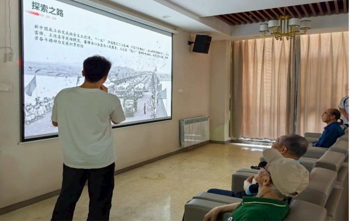 黨史宣講,重溫崢嶸歲月 7月2日,實踐活動聚焦“黨史學(xué)習(xí)教育”,旨在讓老人們在回顧歷史中感受黨的初心與使命。當(dāng)天上午,隊員們提前來到養(yǎng)老院活動室布置宣講會場,將黨史資料、革命先輩照片整齊張貼,營造出濃厚的學(xué)習(xí)氛圍。