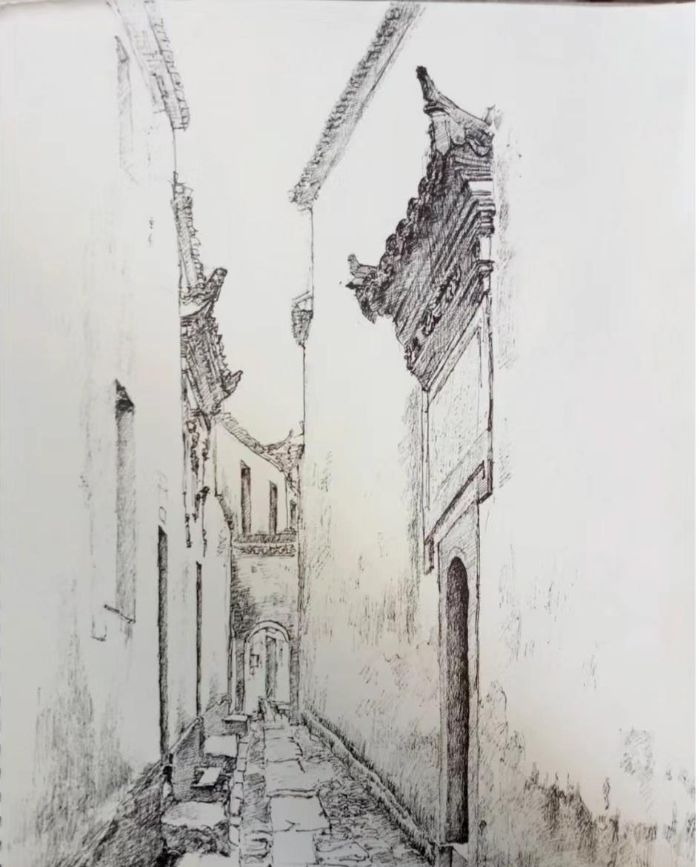 柘皋鎮(zhèn)的傳統(tǒng)建筑風(fēng)貌,設(shè)計(jì)學(xué)院學(xué)子描繪古鎮(zhèn)美學(xué)的"天然畫(huà)板"。實(shí)踐隊(duì)分為3組,帶著速寫(xiě)本穿行于老街巷陌,用畫(huà)筆記錄建筑細(xì)節(jié)。在北閘老街,隊(duì)員們發(fā)現(xiàn)民居多為"前店后宅"格局:臨街木質(zhì)鋪板門(mén)白天卸下可營(yíng)業(yè),夜晚裝上則成居所,兼具實(shí)用與靈活;"硬山式"屋頂設(shè)計(jì)讓山墻高出屋面,既防風(fēng)防火,又契合江南水鄉(xiāng)氣候。設(shè)計(jì)專(zhuān)業(yè)隊(duì)員張昊坐在青石臺(tái)階上,專(zhuān)注地勾勒著民居立面,精準(zhǔn)捕捉門(mén)窗比例、屋頂坡度等建筑細(xì)節(jié)。