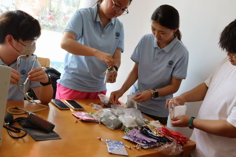 除了現(xiàn)場(chǎng)服務(wù),學(xué)子們還精心準(zhǔn)備了“手作溫情”環(huán)節(jié)。他們現(xiàn)場(chǎng)演示并指導(dǎo)老人參與手工香囊制作。桌上鋪滿艾葉、薄荷、陳皮等中藥材,隊(duì)員們一邊講解藥材功效,一邊帶領(lǐng)老人填充香囊袋。一個(gè)個(gè)飽含心意、兼具驅(qū)蚊防病功效的精致香囊被送到老人手中。這些帶著溫度的手作禮物,承載著學(xué)子們守護(hù)老人健康的誠(chéng)摯心意。