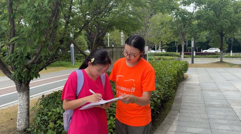 圖為團(tuán)隊成員與調(diào)查者交流調(diào)查問卷。丁惠玲攝