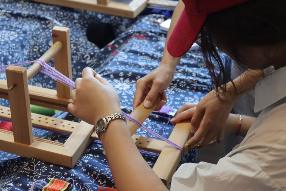 此外,團(tuán)隊(duì)還拜訪了彩帶的非遺傳承人藍(lán)老師。畬族彩帶是畬族婦女的傳統(tǒng)手工藝品,色彩艷麗,紋樣獨(dú)特,常用于服飾裝飾或節(jié)日饋贈。藍(lán)老師現(xiàn)場展示了彩帶編織技藝,一根根絲線在她手中穿梭,逐漸形成精美的圖案。她介紹,彩帶上的紋樣多取材于自然,如山水、花卉等,也繡有漢字,如“福”字,寓意吉祥如意、幸福安康。彩帶編織不僅是一門手藝,更是畬族文化的象征,承載著畬族人民對美好生活的向往。