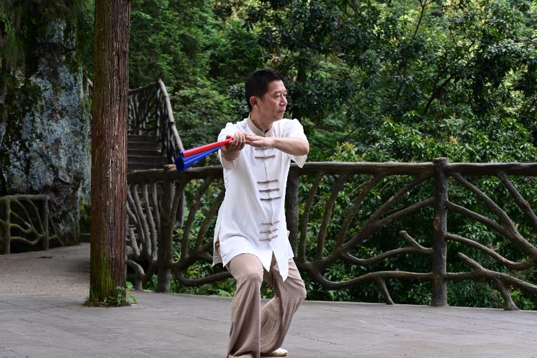 在爬山途中,隊員們的目光被一位晨起鍛煉的村民吸引。只見一位叔叔手持太極扇,身姿挺拔地站著。他輕輕一抖,太極扇如靈動的飛鳥般“唰”地展開,扇面在晨光中閃爍著柔和的光澤。叔叔起勢,腳步沉穩而輕盈,似扎根于大地又蘊含著無盡的靈動。手中的太極扇隨著他的動作翩翩起舞,時而如行云流水般緩緩劃過空中,帶出一道優美的弧線;時而又如閃電般迅速開合,剛柔并濟。隊員們瞬間被這精彩的表演所折服,紛紛圍攏上去,眼中滿是欽佩與好奇。體院學子們立刻開啟“專業模式”,一邊認真地跟著叔叔比劃招式,一邊結合自己所學的運動生理學知識,熱情地和叔叔交流起來。他們耐心地講解著運動前如何進行有效的熱身,才能最大程度減少受傷的風險,還分享了一些關節養護的小竅門。