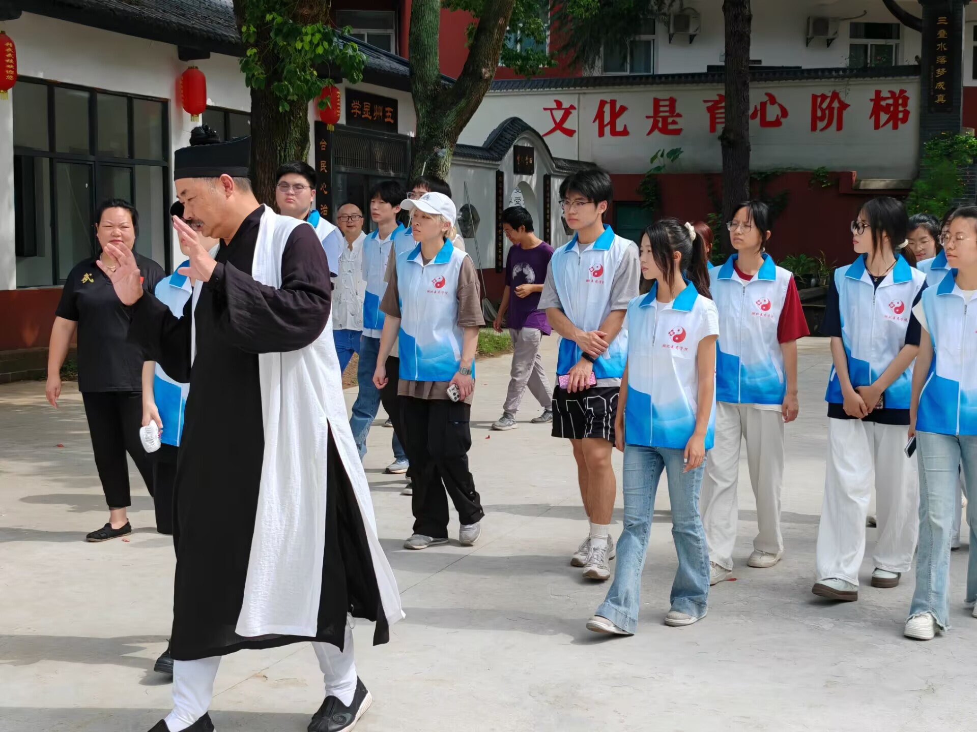 聽道長說“道”,觸摸傳統(tǒng)文化根脈 “武當武術講究‘以柔克剛’,這背后是道教‘天人合一’的哲學思想。”活動一開始,精武武校的肖道長帶著志愿者們走進校內,青瓦灰墻間,道長從太極八卦講到養(yǎng)生之道,從武術招式聊到為人處世。