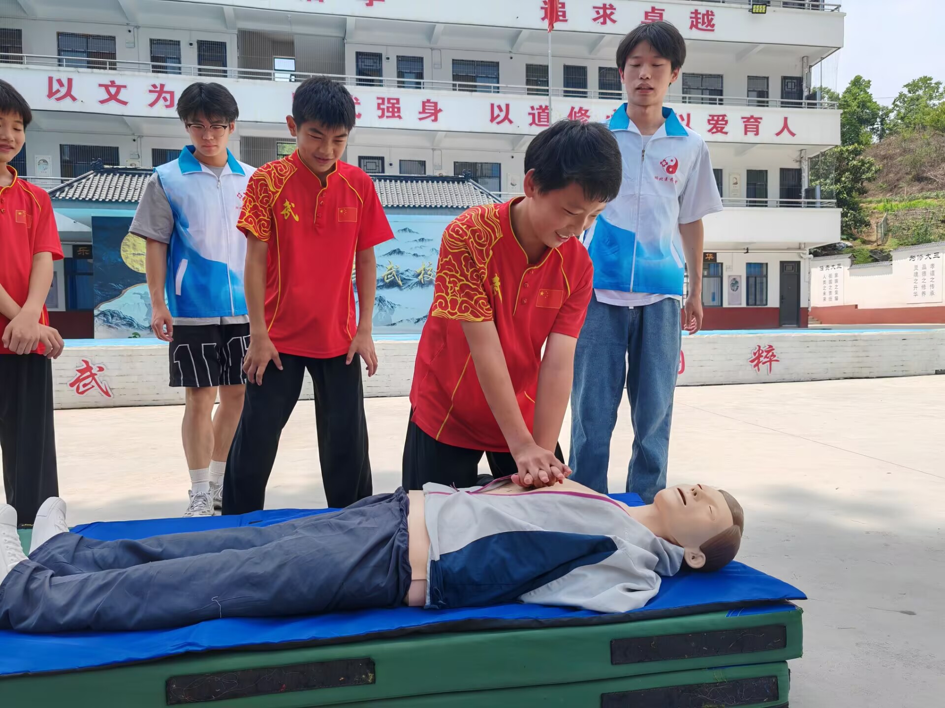 “按壓深度要達到5-6厘米,頻率保持在每分鐘100-120次……”6月28日,精武武校的訓練場上熱鬧非凡,湖北醫(yī)藥學院“醫(yī)武同心”社會實踐隊的隊員正手把手教武校學生練習心肺復蘇,而就在幾小時前,他們還圍坐在一起,聽肖道長講述武當武術與道教文化的淵源。這場傳統(tǒng)與現(xiàn)代的碰撞,成了校園里最亮眼的風景。