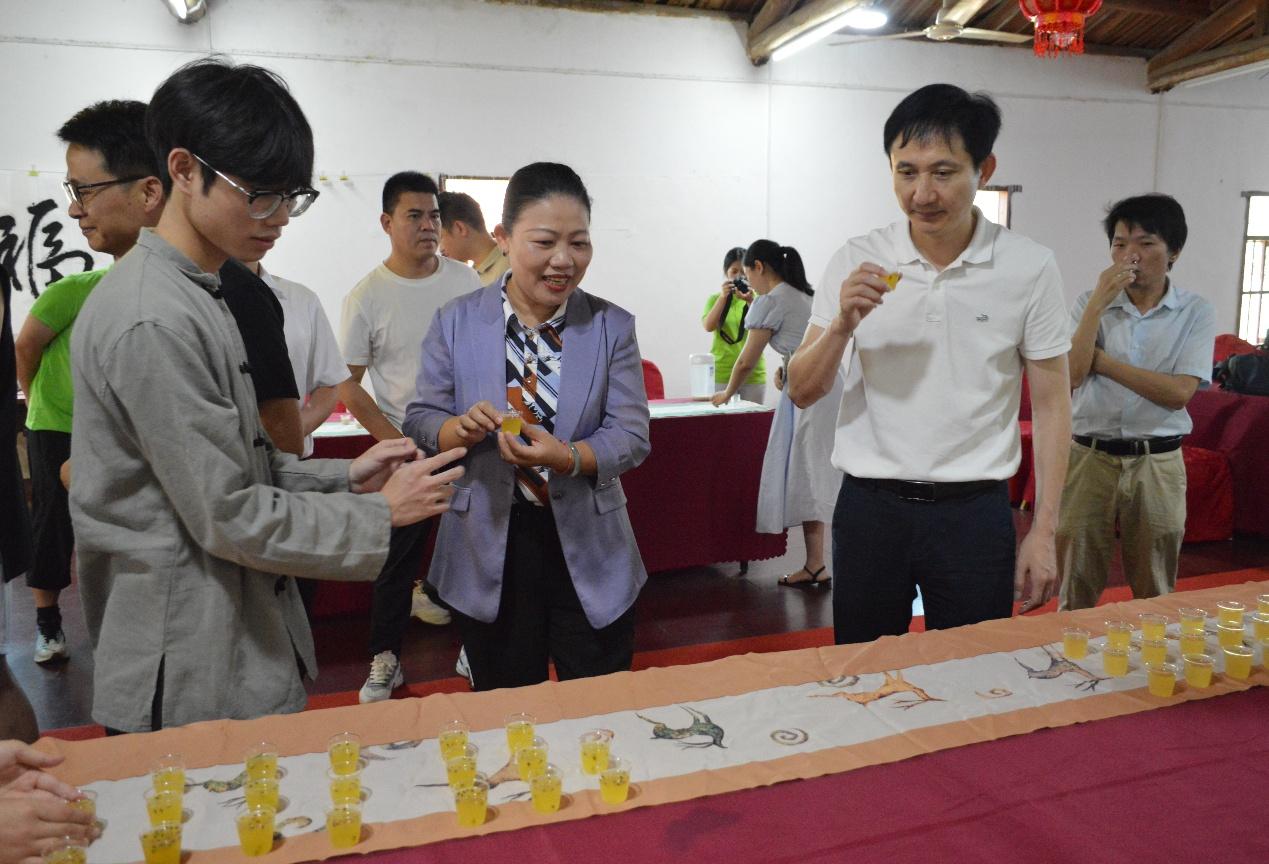 郭玉瓊院長、傅清霖書記分別圍繞“勉勵學生繼續發揮專業所長為鄉村振興貢獻福農智慧”“持續深化合作讓校地共建再結碩果”進行發言。活動現場,三下鄉實踐隊學生代表展示了結合眉山特色資源設計研發的四款新式茶飲、百香果IP形象展示、茶中藥香囊等產品。其中,在安溪茶學院林東藝老師的指導下,以眉山鄉當地盛產且品質優良的紅茶和鐵觀音作為核心茶基底并將當地特色農產品作為主要原料,研發的四款新式茶飲備受好評。同時詳細匯報了圍繞當地特色農產品進行考察,特別是新式茶飲研發所取得的扎實進展,獲得與會領導和老師的充分肯定。