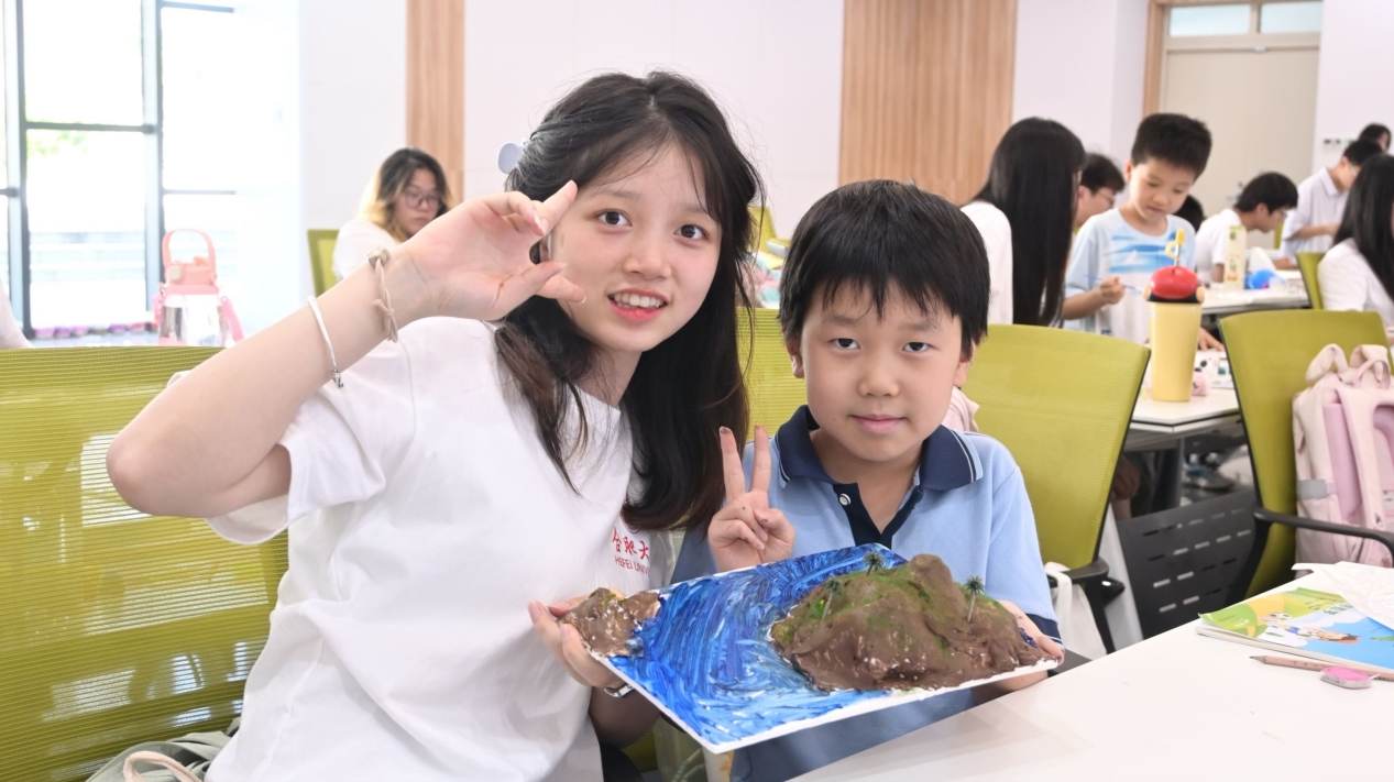 地理知識科普課上,志愿者武晴晴采用故事化講解與互動問答相結合的方式,引導孩子們與志愿者共同動手制作地理模型。在捏塑與搭建的過程中,孩子們直觀體驗了象鼻海岸、火山噴發等地理現象的形成原理,相關知識點也潛移默化地印入腦海。