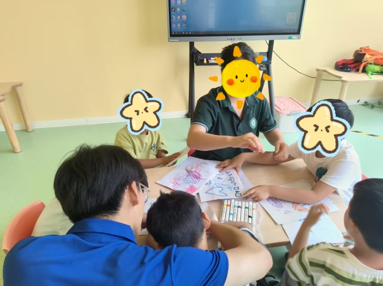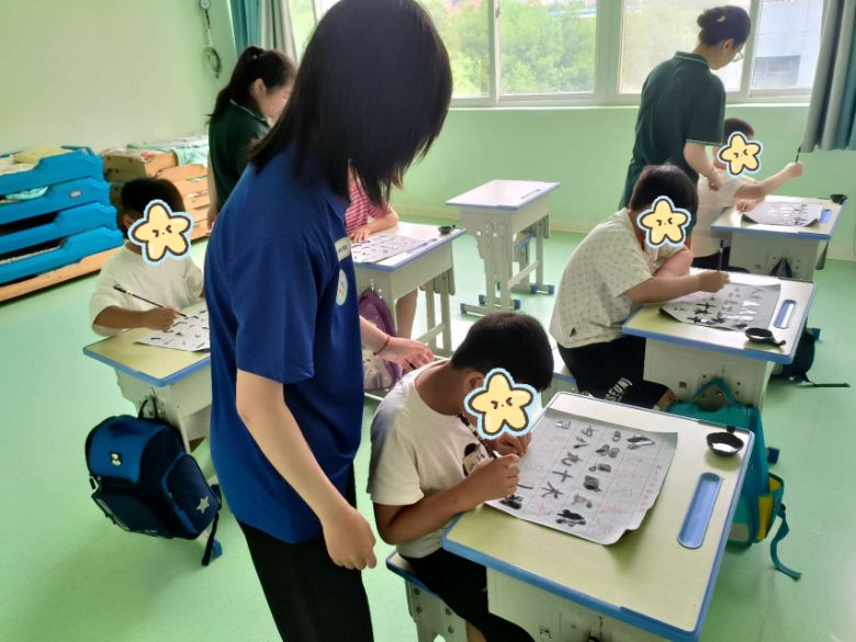 同時,通過七彩假期活動提供的材料包,志愿者們為每個班級精心策劃了趣味十足的互動環節。向日葵班在志愿者的帶領下,通過中國地圖學習了地理知識,學習認識了祖國旗幟及背后的故事;晨曦班在志愿者及老師的帶領下學習了以文明生活為主題的各類知識,如垃圾分類知識、生活中的健康知識、交通安全知識;蒲公英班采取團隊集體游戲的形式,進行了飛盤游戲,孩子們開心地和志愿者姐姐拋接飛盤;學齡一班的孩子們發揮創意和想象,利用彩泥,在老師和志愿者姐姐的陪伴下共同完成了幾個可愛的小章魚,學齡二班的孩子們拿到了“書畫最美漢字”的材料包,拿起毛筆,學習了毛筆字;少年班進行了搭建吸管積木的游戲,在志愿者的引領下,發揮創意,動手操作,拼出他們的奇思妙想。