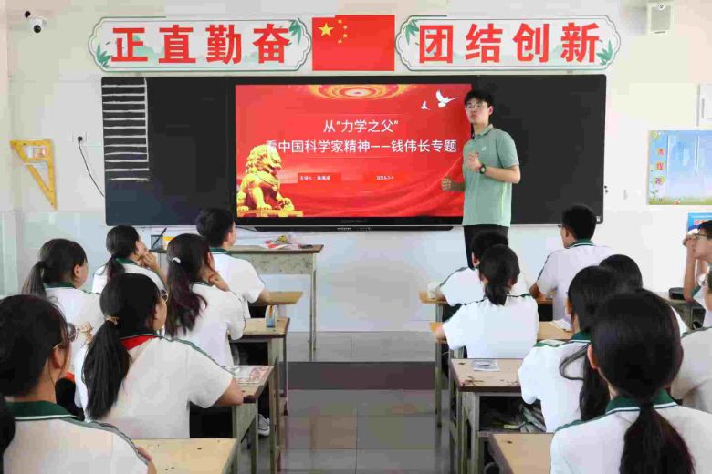 7月4日,河南師范大學(xué)物理學(xué)院“推普傳科韻”科學(xué)家精神宣講團(tuán)走進(jìn)常村鎮(zhèn)中心學(xué)校,以錢學(xué)森、錢偉長(zhǎng)等科學(xué)家的成長(zhǎng)故事為核心,為當(dāng)?shù)貙W(xué)生帶來一場(chǎng)兼具溫度和深度的宣講活動(dòng),在青少年心中播撒科學(xué)與愛國的種子。