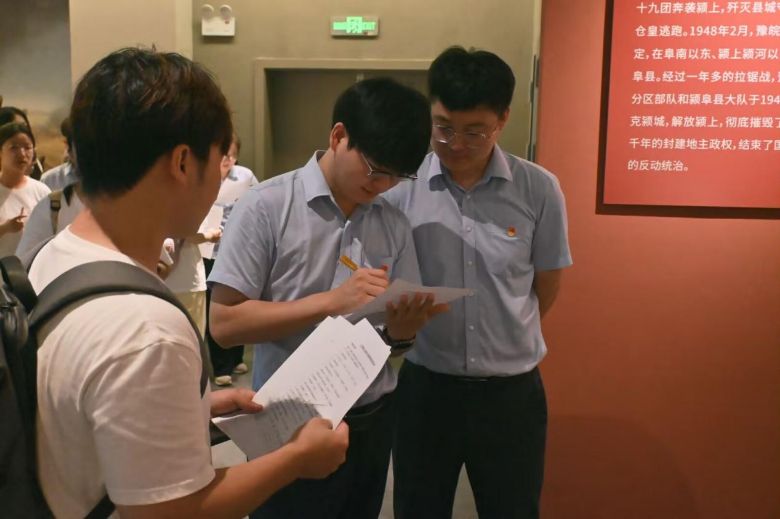 在管仲博物館內,團隊成員們認真聆聽著講解員講述這位“華夏第一相”的傳奇故事,通過觀看《管子》思想數字墻,深入了解管仲在農業、政事、軍事等方面的改革措施。在“管鮑之交”復原場景旁,隊員們仿佛“穿越”千年時光,來到了管仲身邊,探訪其獨特的政治智慧如何推動齊國成就一番諸侯霸業。管仲的治國智慧綿延傳承,其“以人為本、禮法并重”等思想,至今仍是基層治理的寶貴遺產。“不慕古,不留今,與時變,與俗化",如今,潁上的文化基因正在青春實踐中煥發著新的生機。