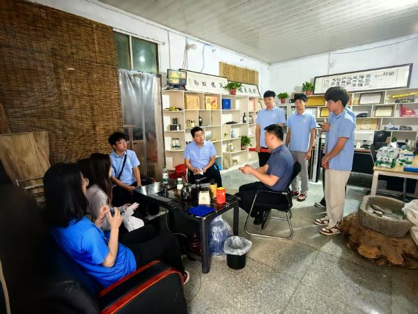 在電商產(chǎn)業(yè)園,促進團對話當?shù)禺a(chǎn)業(yè)帶頭人陳開森。其辦公室內(nèi),“宿州市農(nóng)村青年創(chuàng)業(yè)致富帶頭人”等榮譽牌匾,講述著從2014年朋友圈賣梨到如今運營多平臺、帶動200余戶農(nóng)戶增收的創(chuàng)業(yè)歷程。陳開森通過統(tǒng)一供苗、技術(shù)培訓(xùn)、訂單收購,將小農(nóng)戶納入標準化產(chǎn)業(yè)鏈,讓“老手藝”對接“新市場”。他的故事是碭山“新農(nóng)人”的縮影:既懂傳統(tǒng)種植,又善電商運營;既深耕土地,又胸懷市場。陳開森還跟促進團員們說:“雖然我的初衷是用互聯(lián)網(wǎng)賺錢,但隨著碭山酥梨產(chǎn)業(yè)越做越好越來越受到各地人名的喜愛,我也有了屬于自己家鄉(xiāng)的榮譽感!”這些“領(lǐng)頭雁”以創(chuàng)業(yè)激情點燃產(chǎn)業(yè)升級火種,吸引更多青年返鄉(xiāng),為鄉(xiāng)村振興注入人才活力。