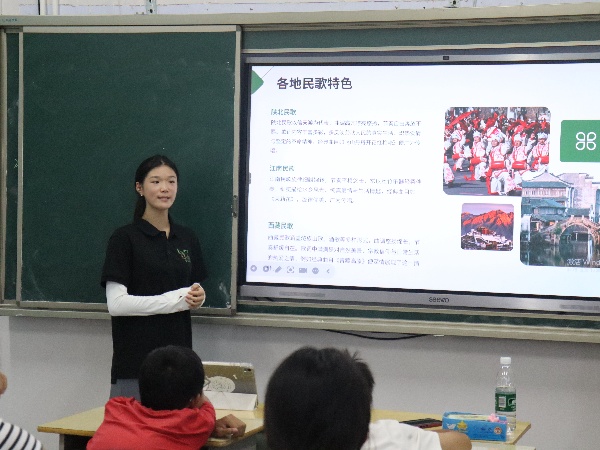 課程開始,“青苗筑夢”暑期社會實踐團成員使用奧爾夫音樂教學法中的“拍蚊子”游戲暖場。同學們跟隨節奏拍手、踏步,在趣味互動中激活音樂感知力,教學氛圍輕松,同學們十分活躍。暖場結束后,課程正式進入民族音樂鑒賞環節。實踐團成員從民歌起源為切入點,講解了民族音樂在勞動生活、民俗活動中的孕育過程,除此之外還向同學們介紹了號子、山歌、小調這三大主要類型及其藝術特點。