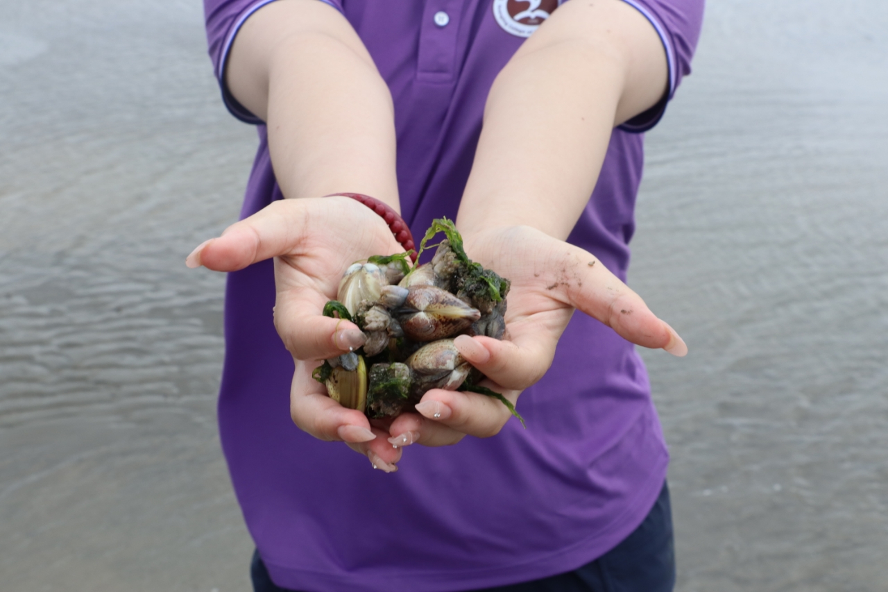 | (圖為7月5日,“碧海青耘,向海而興”團隊成員展示所挖文蛤。孫佳康供圖。) |