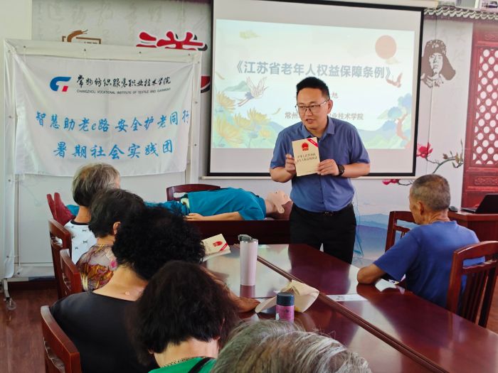 活動期間,實踐團精心策劃并實施了五大主題板塊,內容豐富、形式多樣。在“學急救知識,守家人平安”環節,志愿者們現場演示了AED器材的使用方法和人工呼吸操作流程,使老年人掌握了基本的應急救護技能,增強了他們在緊急情況下的自救互救能力。在“宣普法知識,護老年權益”板塊,指導老師俞旭為老年人帶來了生動的普法宣講,提高了他們的法制意識,同時,他還提供了現場咨詢服務,解答老年人在法律維權方面的疑惑,并助力構建社區與法律顧問的長效合作機制。在“銀發就業發余熱,社會添彩增活力”環節,實踐團成員先后調研了常州市人社局、武進區人才服務中心與竹園社區黨群服務中心等相關部門,系統了解了當前常州市人口老齡化的現狀,以及應對人口老齡化所采取的再就業措施,實踐團將針對調研數據結合學校優勢助力常州老年人再就業政策的制定與相關服務的推進。